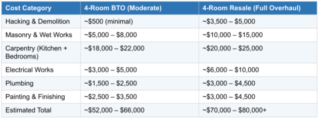 Let's get specific. Whether you're doing a BTO or resale renovation, the same broad cost categories apply — they just hit very differently depending on your situation.