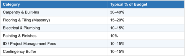Before we get into the "why", let's look at the "how much". These are typical ranges for full renovations managed by an interior designer or renovation contractor in 2025–26. Note that these figures cover renovation works only — furniture and loose appliances are a separate budget conversation.