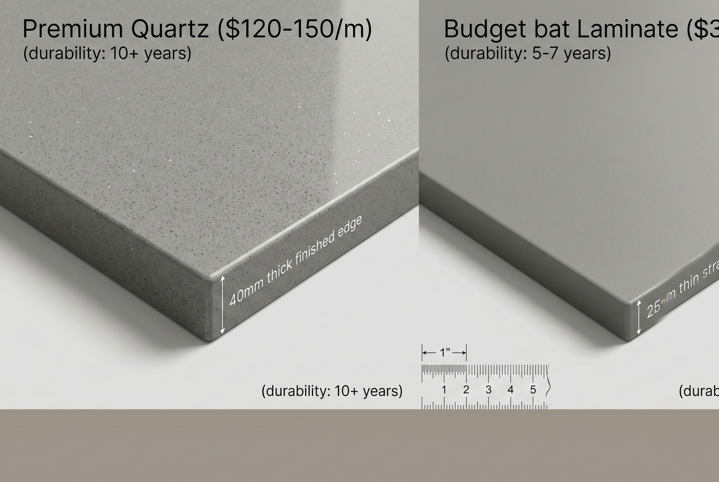 Close-up comparison of premium quartz countertop versus budget laminate countertop showing durability and finish differences