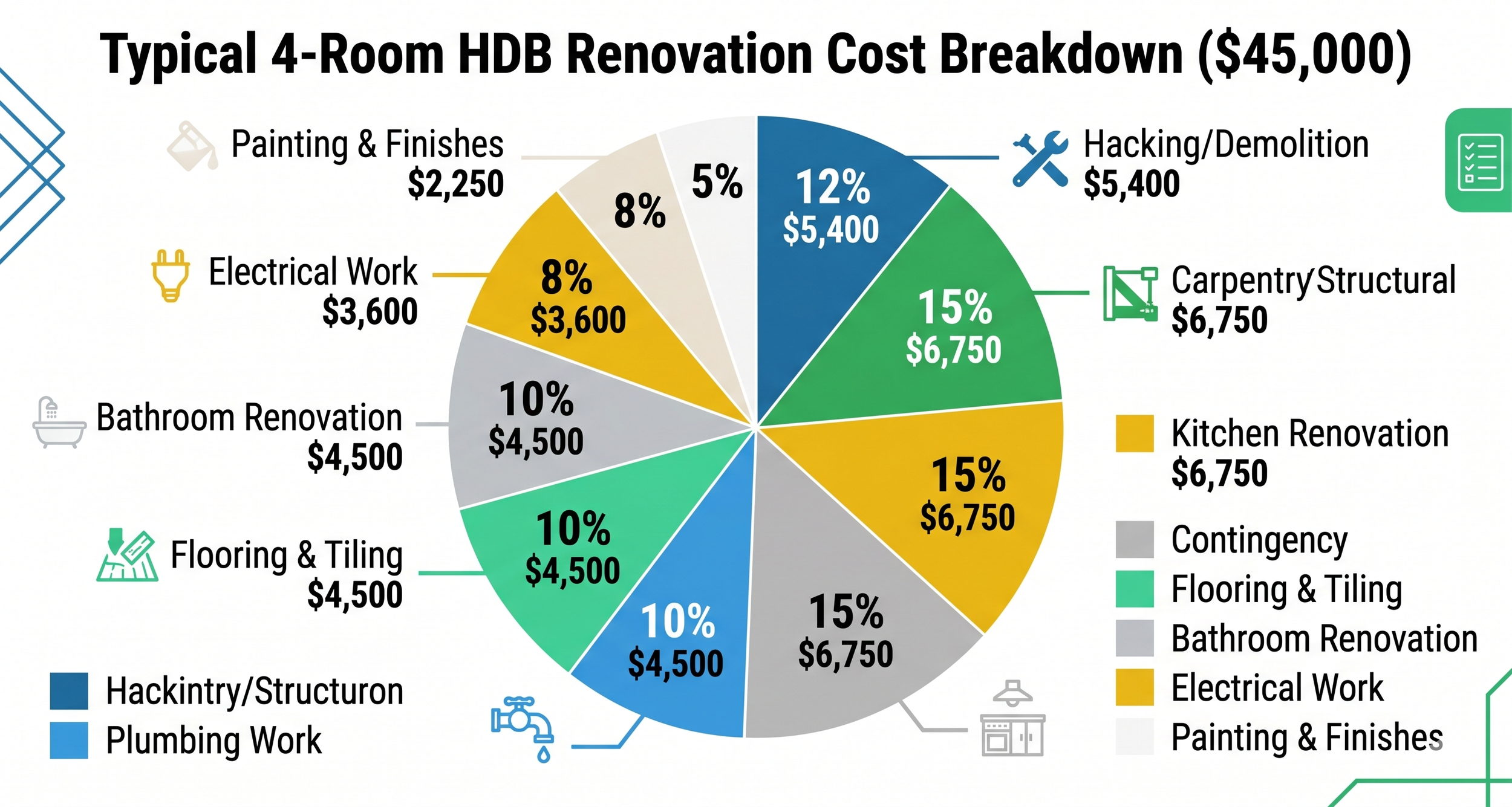 Q: How much should I budget as contingency for an HDB renovation? A: 10–15% of your total renovation cost. For a $45,000 renovation, that's $4,500–$6,750. This buffer covers unexpected hacking, hidden pipes, or structural surprises that always seem to arise.